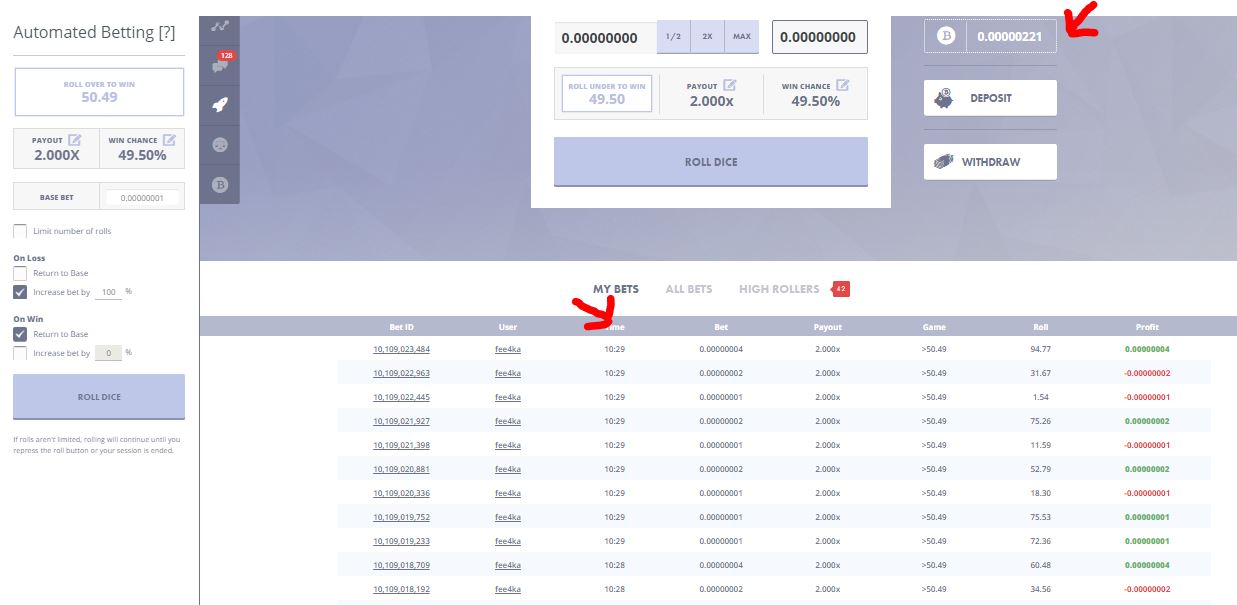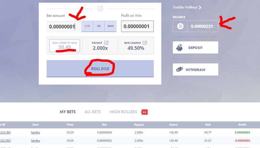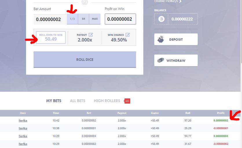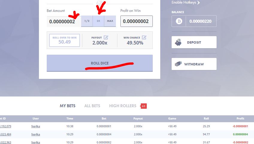 Ручной способ накрутки сатошей на Primedice: