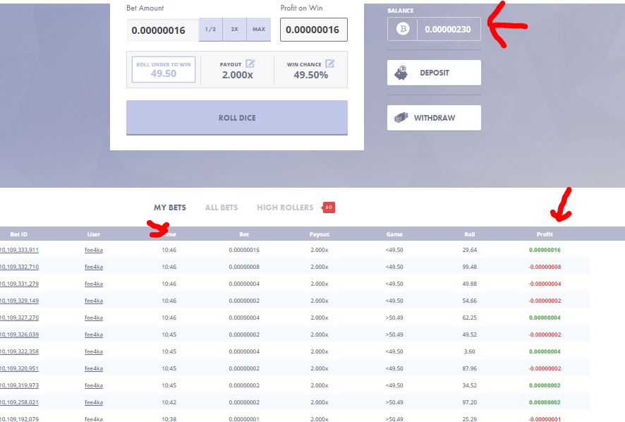 Единственное примечание не повышайте изначальную ставку, всегда на балансе должно хватать откупить хотябы 10 ставок- помните система тоже хитра и коварна. Таким образом дабы поднять первоначальную ставку хотя бы до ....10 сатошиков у вас на балансе должно быть мин 10, 20, 40, 80, 160, 320, 640, 1280, 2560, 5120 = 10 230 сатошей, а нам за прохождение каптчи дают всего 200. Да к стати если вы все же проиграете- вы можете за ввод каптчи получить снова бонусы на свой счет и продолжить игру.
