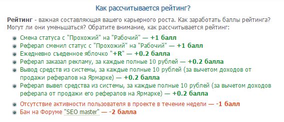 С ростом вашего рейтинга на сайте, растет и ваше звание, а чем выше звание- тем больше у вас появляется преимуществ и растут ваши доходы. На фото видно за, что вы сможете набрать баллы. А я расскажу конкретно о всех статусах. Первый статус: «Прохожий»- его дают сражу же после регистрации на сеоспринте. Как вы понимаете это самый низкий статус, сразу же после заполнения данных о себе и подтверждения имейла- вам присвоят статус до «Рабочий». Рабочий- основной в проекте, они могут выводить заработанные деньги из системы, а так же покупать рефералов и обретать с них прибыль.