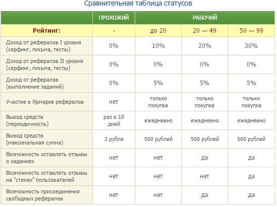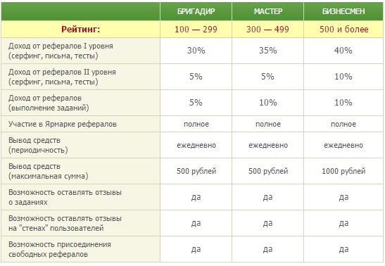 3-й и 4-й статус «Бригадир» и «Мастер». Людям с этим статусом добавляется возможность продавать рефералов на ярмарке, а также получать доходы от рефералов 2-го уровня (рефералов которых пригласили ваши рефералы) И самым высоким- являются люди достигшими на проекте звания- «Бизнесмен». Для его получения вам нужно набрать 500 и более балов рейтинга на seosprint. | |